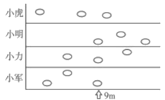 从图上可知,小虎2次的投沙包的成绩平均分布在9米的2侧,那么这2次的平均成绩为9米,剩下的一次投沙包的成绩远小于9米,所以小虎投沙包的平均成绩成绩小于9米;小明一次的成绩为9米,其余2次的成绩大于9米,那么小明投沙包的平均成绩大于9米;小力的一次成绩为9米,其余2次的成绩平均分布在9米的2侧,那么他投沙包的平均成绩大约为9米;小军一次的成绩为9米,其余2次的成绩小于于9米,那么小明投沙包的平均成绩小于于9米,据此解答。